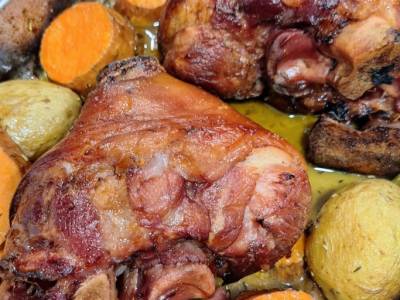 Codillo asado con patatas y boniato