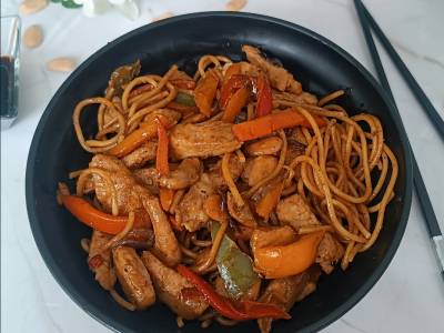 Lomo de cerdo salteado con pimientos y espaguetis al estilo asiático