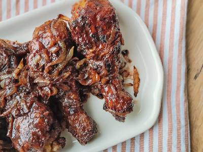 Pollo encebollado al vino tinto