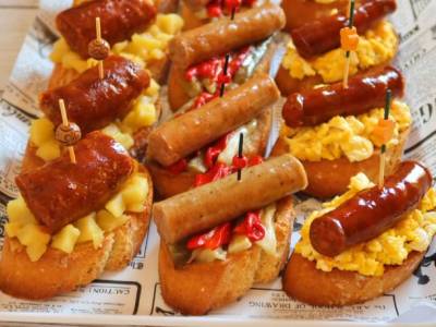 Bandeja de pinchos con chorizo, chistorra y salchicha