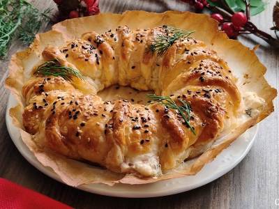 Corona de hojaldre con salmón ahumado y queso