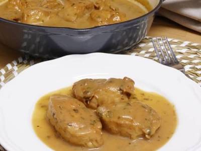 Pollo encebollado al vino tinto