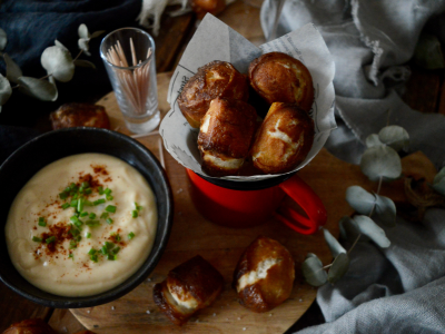 Mini pretzels con salsa dip de cerveza y queso