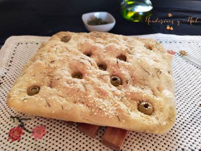 Focaccia con aceitunas, queso y romero, en freidora de aire