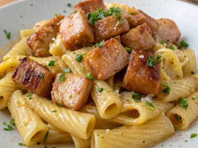 Pasta con lomo al ajillo