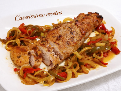Solomillo de cerdo al horno con vino blanco, cebolla y morrones