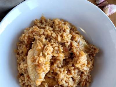 Arroz meloso de pollo al ajillo