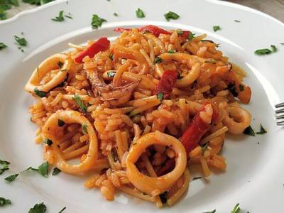 Arroz con sepia y langostinos. Receta fácil y rápida.