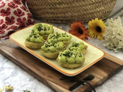 Aperitivo de patatas con alioli de aguacate y lima
