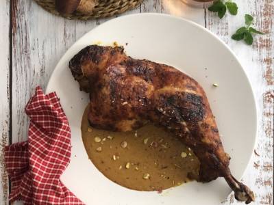 Pierna de pavo al horno, con salsa de pistachos y cítricos