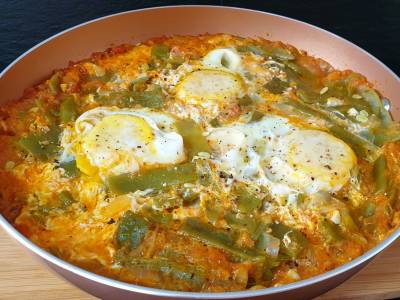 Judías verdes con tomate y huevos escalfados
