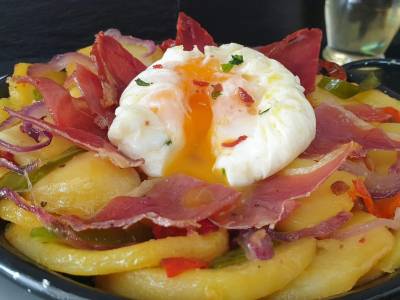 Patatas a lo pobre con jamón y huevo poché