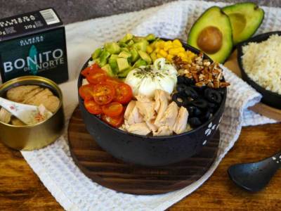 Poke bowl de arroz de coliflor con huevo poché y bonito del norte