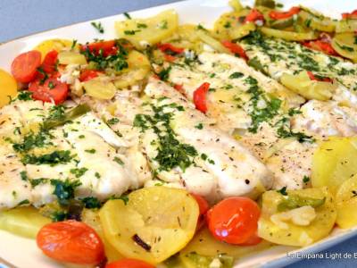 Filetes de merluza al horno con patatas y verduras. receta fácil de pescado al horno.