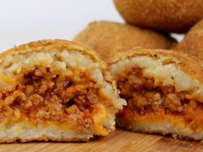 Patatas rellenas de huevo, chorizo y queso en mambo