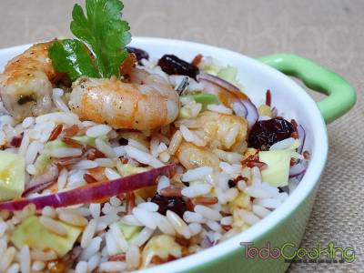Ensalada de arroz con gambas, aguacate y arándanos con toque asiático