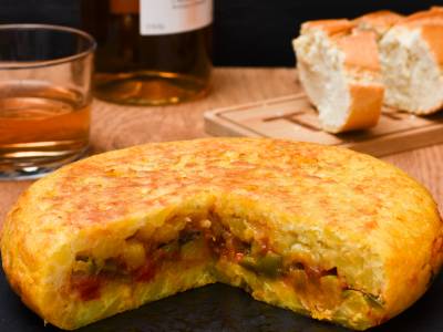 Tortilla de patatas con bacalao y pimientos